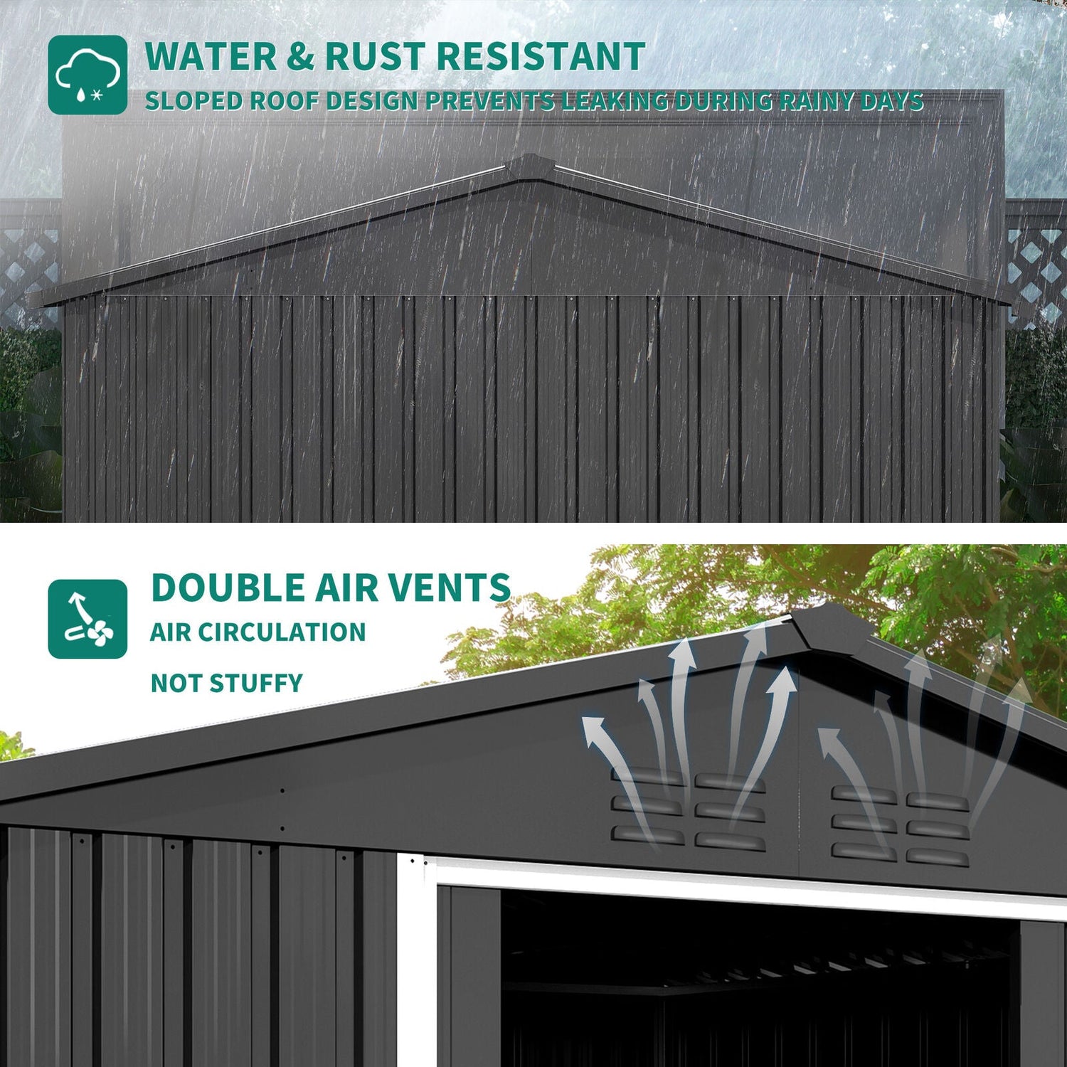 - All-Weather Practicality: Thickened galvanized steel and a durable frame harmonize to offer this outdoor storage shed great rust protection; Overlapping wall panels work with tilted roof to prevent rainwater from gathering or seeping in for year-round use.
