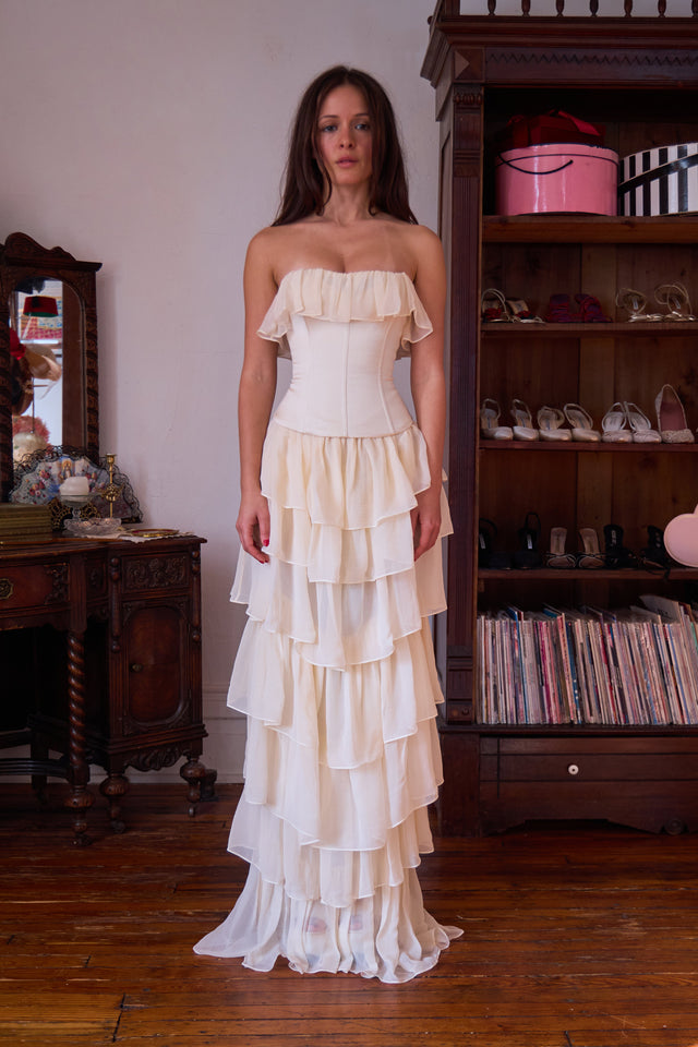 - Designed in New York. A silk chiffon gown featuring ruffled tiers and a bust ruffle with silicone elastic trim along the top edge. Includes an invisible zipper and hook-and-eye closure at the center back. Designed with a lightweight mesh bodice and an internal shelf bra with its own hook-and-eye closure. Shown with the Ballet Russes Corset, sold separately. Also available in Noir.